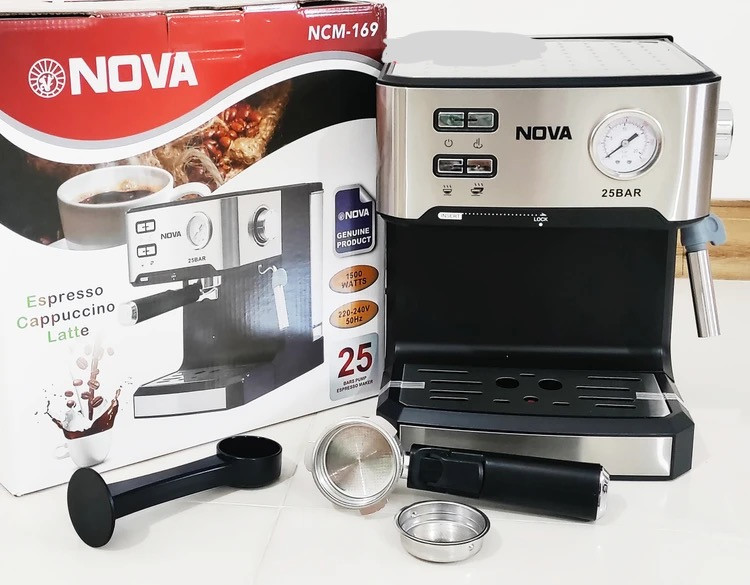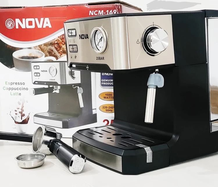 اسپرسو و قهوه ساز 1500 وات اتوماتیک نوا پمپ 25 بار اسپرسوساز نووا با هواگیری رایگان مدل NOVA NCM-169 مشکی
