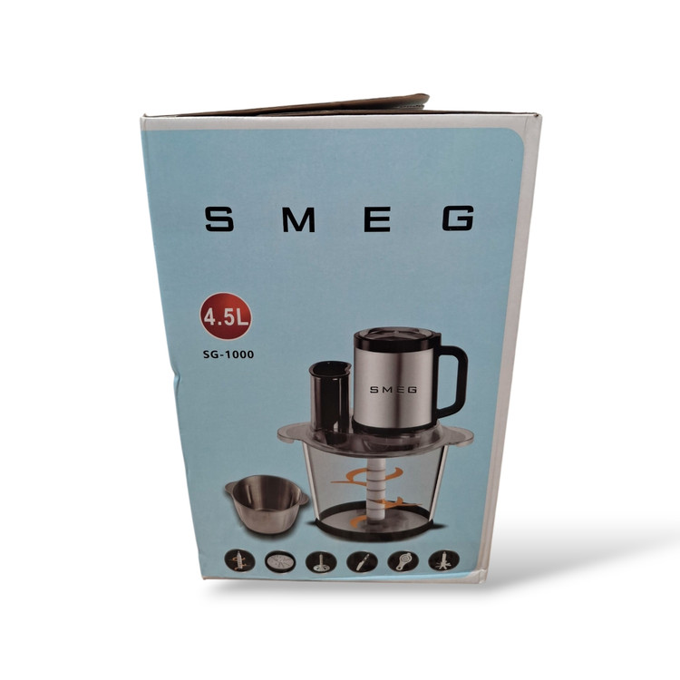 خردکن و غذاساز اسمگ مدل SG_1000 یکی از جدیدترین محصولات تحت لیسانس شرکت اسمگ می باشد که با قابلیت و کارایی بالا نتوانسته یکی از بهترین و پرفروش ترین خردکن های موجود در بازار باشد، این خردکن با ظرفیت 4.5لیتر و توان 3500 وات قابلیت خرد کردن ، رنده کردن ، مخلوط کردن و اسلایسر انواع مواد غذایی گوشت سیب زمینی ، سبزیجات ، میوه ها و غیر را دارد ، جدا از کارایی خردکن دارای صفحه رنده ، و برش ورقه ای (اسلایسر )می باشد ، همچنین دارای همزن پلاستیکی بزرگ جهت تهیه انواع سس ، و مخلوط کردن انواع مواد می باشد ، از ویژگی این مدل می توان ، به قاشق جدا کننده سفیده و زرده تخم مرغ ، سیر پاکن ، صفحه دو طرفه مخصوص رنده و برش ورقه ، شش تیغه تیتانیوم طلایی و همچنین یک کاسه استیل یدک اشاره کرد.